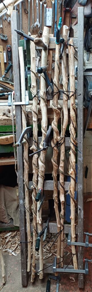 Na het schillen worden ze rechtgebogen in de klemmen en vervolgens laten we ze drogen. Na het drogen worden ze geschuurd, voorzien van een knop en krijgt elke stok een gaatje voor de veter.